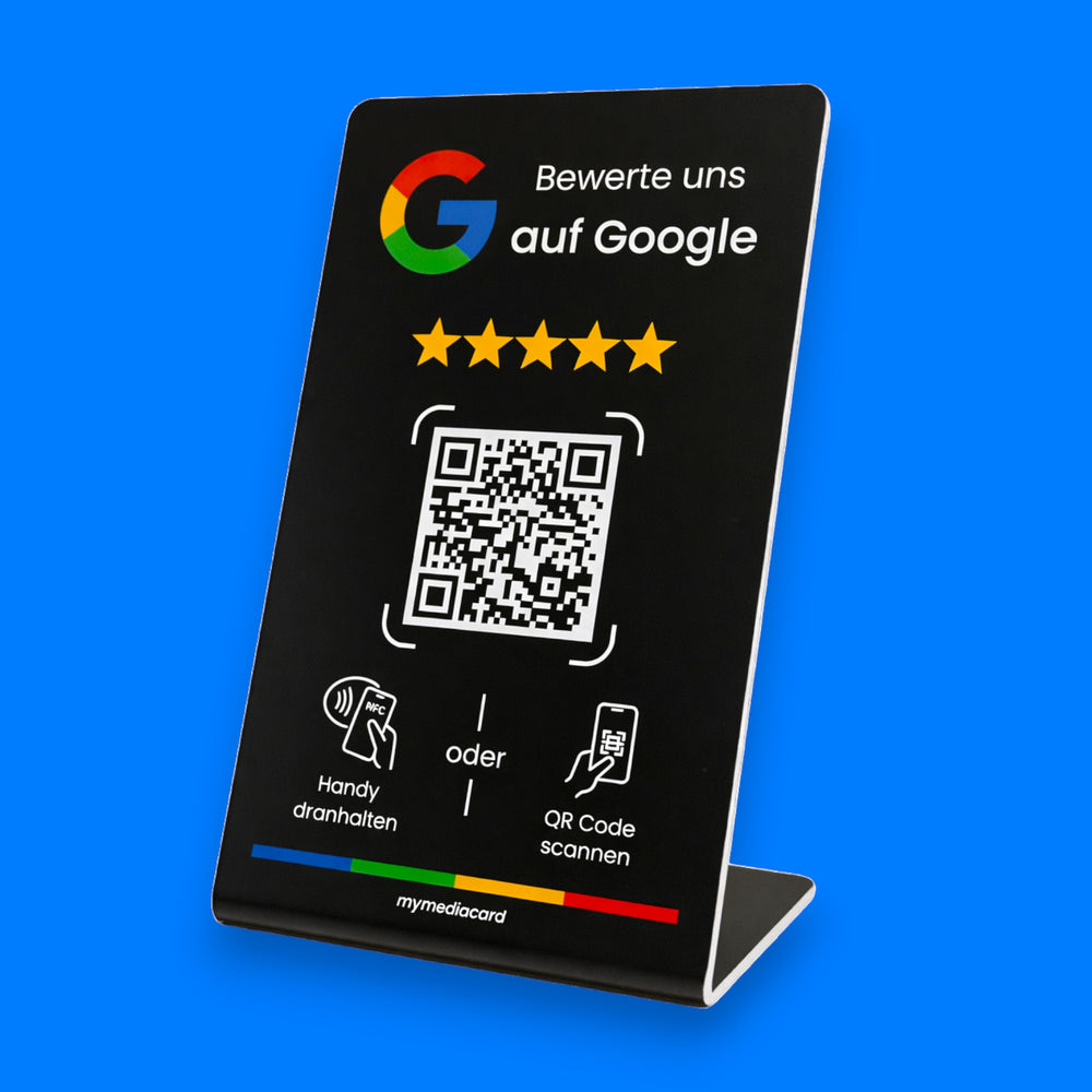 Steigern Sie Ihre Online-Sichtbarkeit und ziehen Sie mehr Kunden an! Mit integriertem NFC-Chip und QR-Code können Ihre Kunden schnell und einfach Bewertungen abgeben.